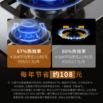 采用劲燃系统,将火孔均匀分布,使锅底受热均匀,燃烧效率高。采用四环进风混燃设计,使用有效减少废气,节能省钱。