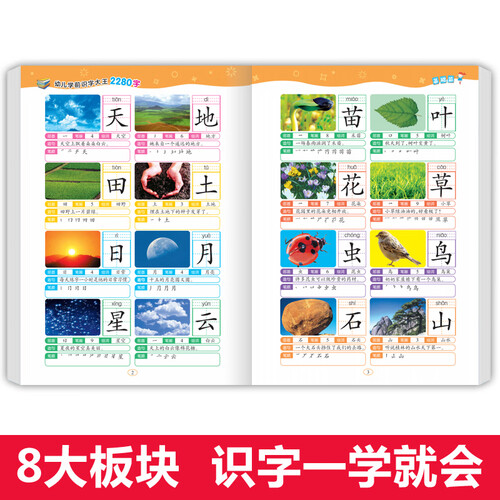 包含6册,每册收录380个字,根据难易、繁简、使用频率进行编排。采用一字一图的方式引导孩子学习,更加生动直观。