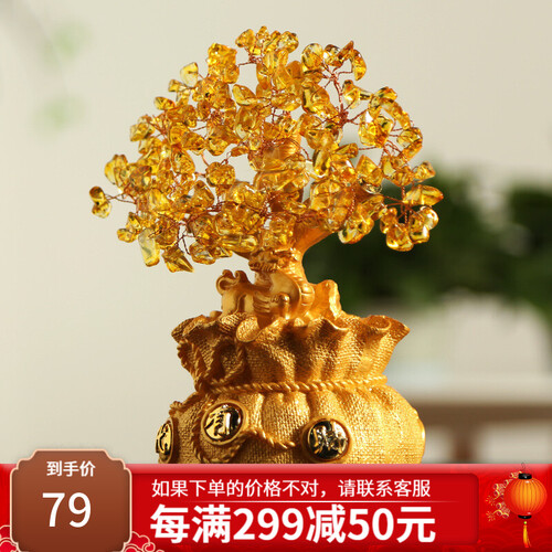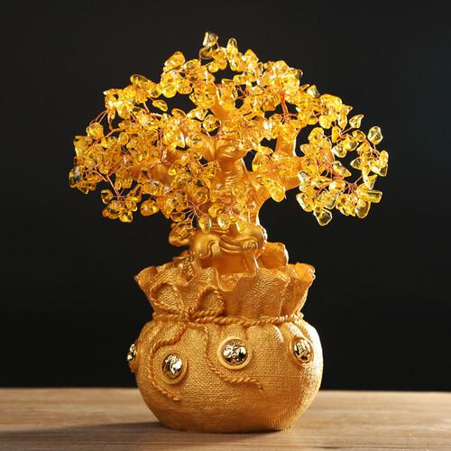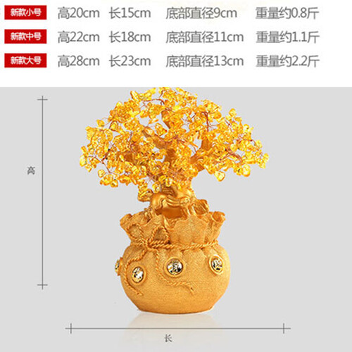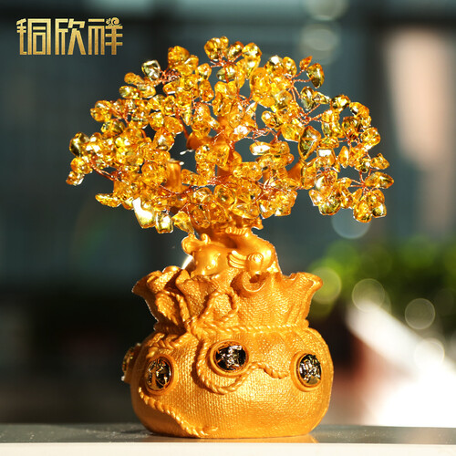装饰摆件使用经典的招财树和貔貅的形象,同时更加有创意地将古代荷包作为底座,既经典又新潮,枝叶上的水晶材质更显美观时尚。