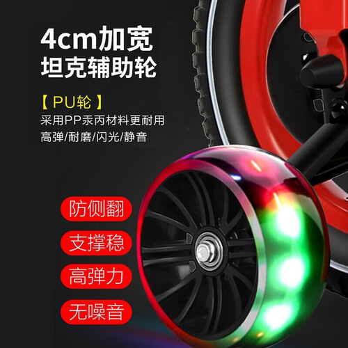 采用了PU七彩闪光辅助轮,辅助轮会让宝宝在学习骑行时不易摔倒,让宝宝在学车时更加大胆,七彩的闪光,让宝宝一眼就爱上。