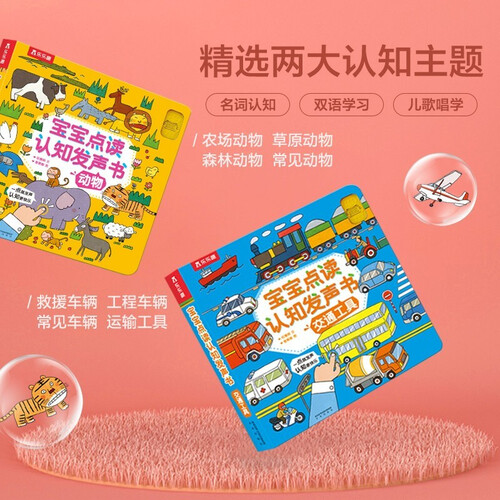 专为低幼宝宝打造的认知发声书,教宝宝认知动物和交通工具。每个跨页均为场景图,宝宝用小手按下发声位置,就会发出中英文音效。