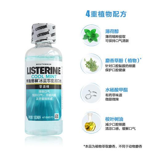 融入四种不同的植物配方,麝香草酚有效针对口腔黏膜细菌,深度呵护口腔健康。添加清新的薄荷醇,时刻保持口气清新。