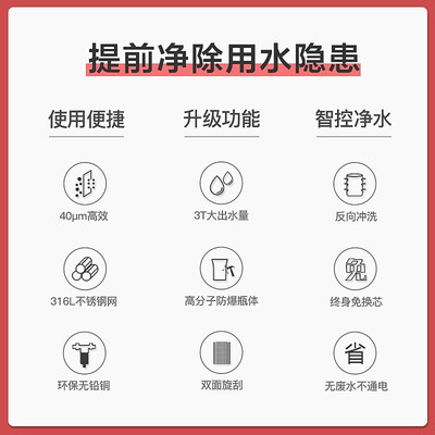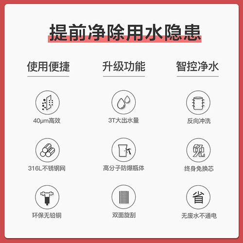 采用不锈钢滤网,可以过滤大水流,满足多个龙头同时使用。滤网免拆洗设计,多方位立体冲刷,清洁更彻底。