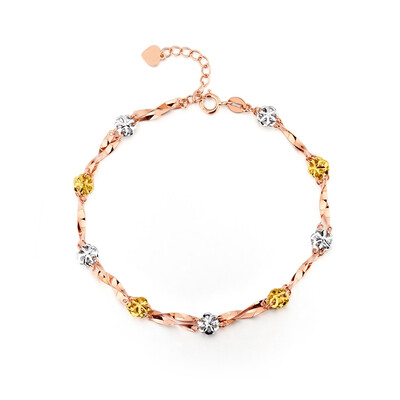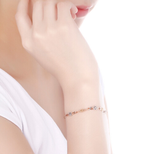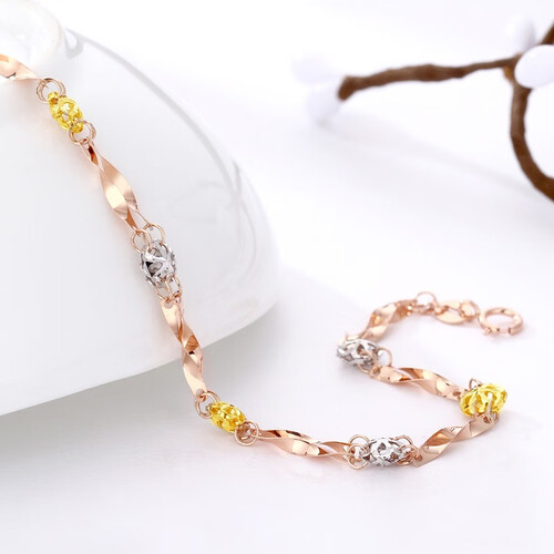 手链由白、黄、玫瑰三色18K金花环绕而成,结合上清新时尚的色泽,佩戴在手腕上显得时尚更加亮眼。