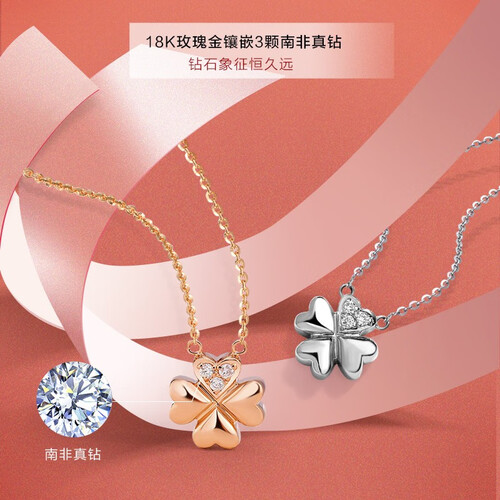以四叶草为设计主题的设计,带来属于你的幸福花语,更适合买来送人。上面镶嵌南非真钻,能提升整体的品质。