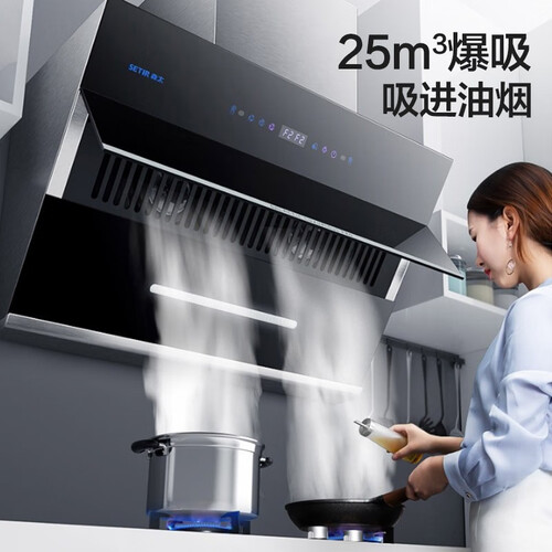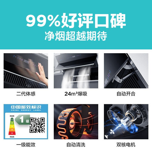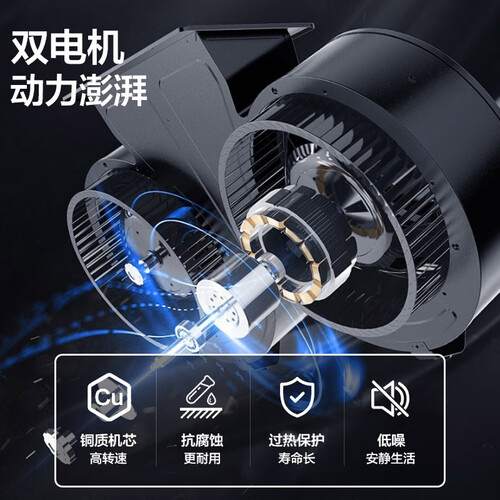 双电机工作,左右按需求开启,有效吸走油烟,环保又节能。红外线体感操控系统,操作简单,便携方便。低噪音设计,使用更舒心。