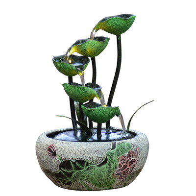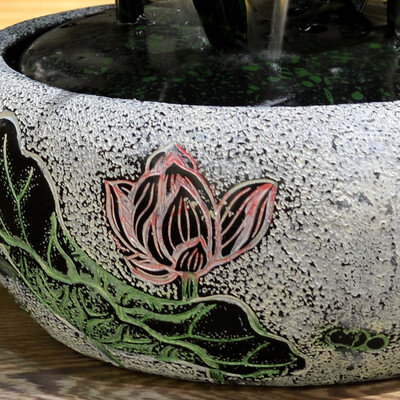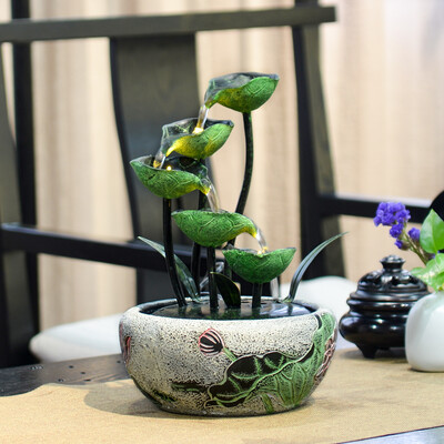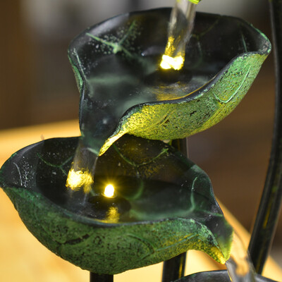 精致的荷叶托盘搭配小灯,搭配涓涓流水,营造出让人赏心悦目的景象;底座为雕花器皿,经过手工雕模而成,质感细腻。