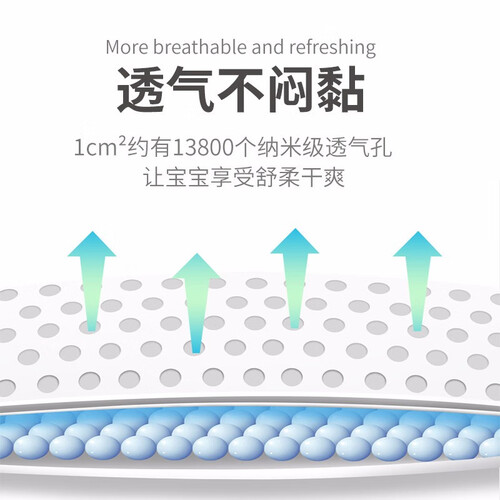 采用无纺布舒适大环腰设计,更能呵护宝宝肌肤不勒腰;柔软的面层采用打孔设计,可以更好的促进尿液吸收,长久保持干爽不闷热。