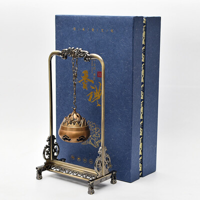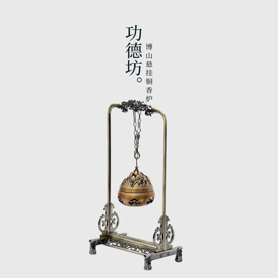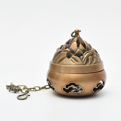 采用悬挂式的方式,可以将香炉凌空托起,宛如一座雄壮的山峰。材质选用纯铜,后用立体雕刻制作精美螺纹花纹。