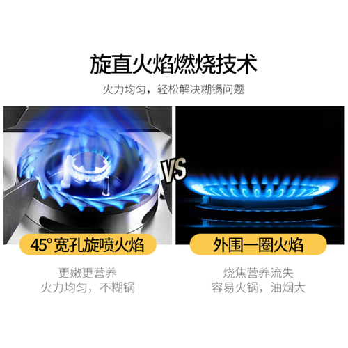 采用旋直火焰燃烧技术,使火力燃烧更均匀,可防止糊锅。搭配5段火候,可准确调控,煎炒蒸煮样样精通。