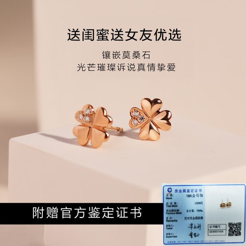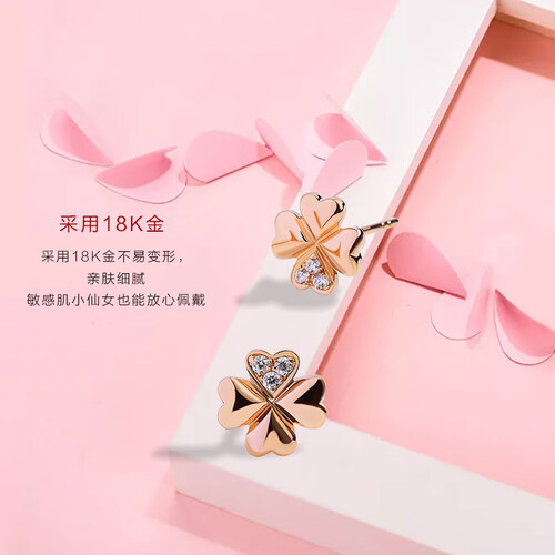 采用18K金材质打造,质地坚硬,细腻亲肤,敏感肌也能放心佩戴。搭配四叶草造型,简单耐看,雅致美观。