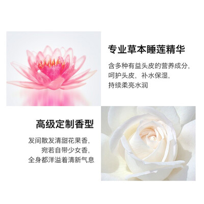 小分子防止毛鳞片翘起,快速锁水,抚平毛躁。睡莲精华能修护损伤,提供贴心的护理,保护头皮。
