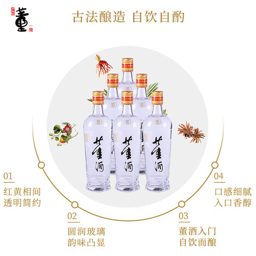选用颗粒饱满的高品质高粱,经过蒸煮人工踩曲,入窖发酵,存放三年后经过勾调,产出优质董香型白酒。齿夹留香,通体舒畅。