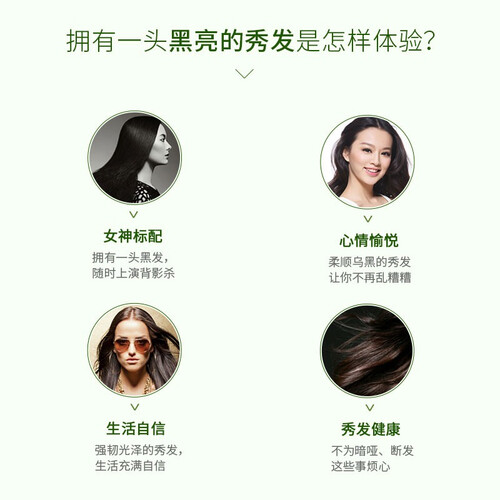 添加何首乌成分,可以让秀发更强韧有力,有效固定发根。蕴含黑芝麻成分,可以帮助头发黑色素的形成,让头发更有光泽。