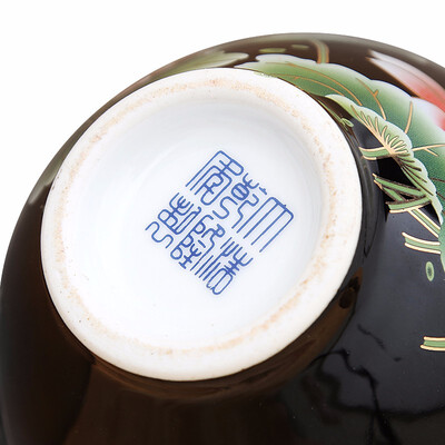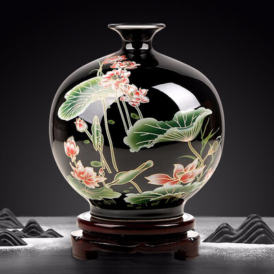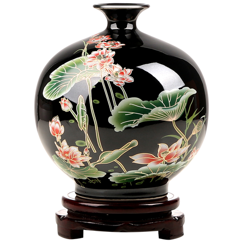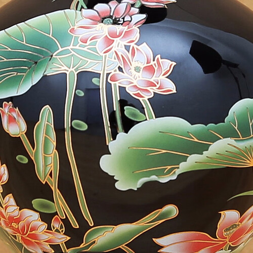 花瓶为乌金釉质地,瓶身整体细腻,净亮如镜。荷花图案线条柔和,色彩鲜明,整瓶浑圆有致,美感十足,收藏或送人,都十分合适。