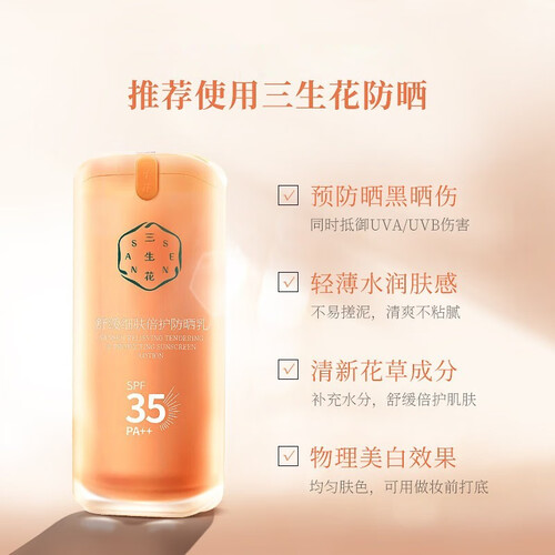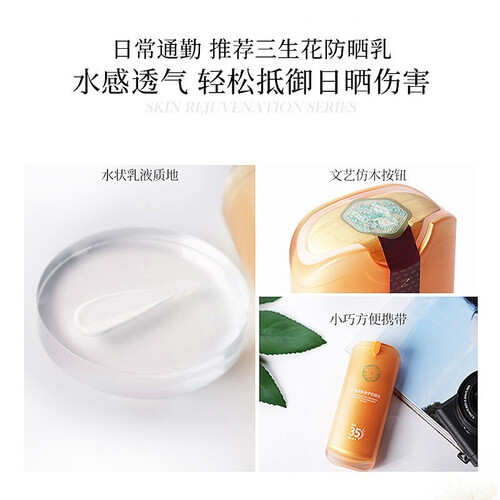 水润防晒伤,减轻紫外线带来的干燥感,预防肌肤晒伤,用作妆前保湿,不会浮粉,底妆更舒贴。