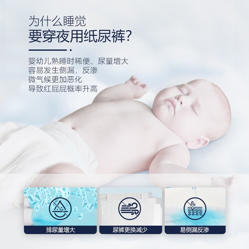 尿裤加入泛醇成分,温和护肤,可减少尿液刺激宝宝肌肤。采用专利麦田网格吸收压纹,可网住稀便和锁住尿液。
