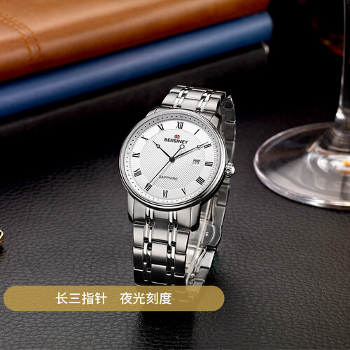 手表的时间刻度采用夜光设计,即使在夜晚也能清楚的看见,读时更清晰。表扣采用双按蝴蝶扣,佩戴轻松,单手也能操作。
