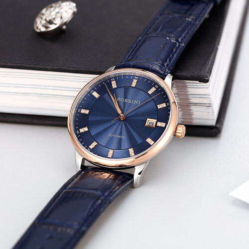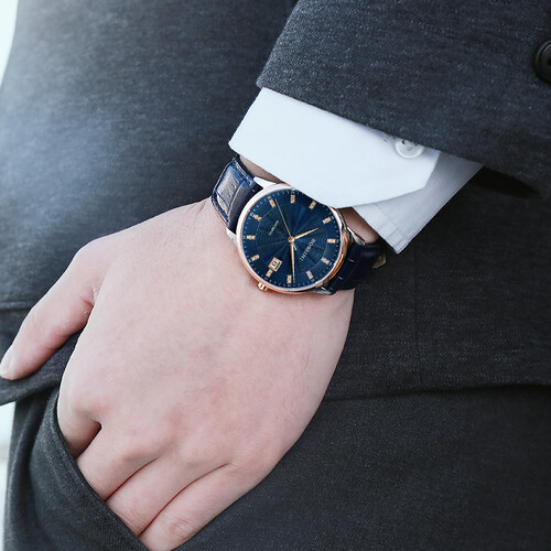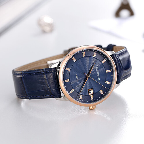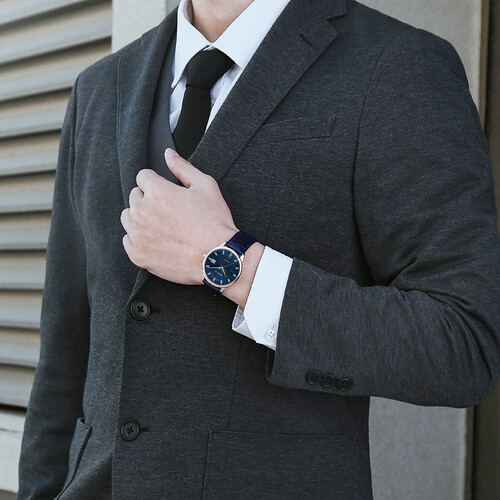 蓝色的牛皮表带搭配蓝色的表盘设计,优雅深邃不乏时尚感,佩戴舒适,简约的十二刻度设计,读时清晰准确