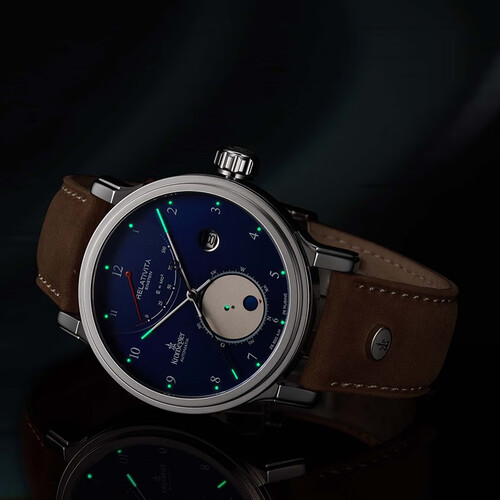 将不同颜色的底盘嵌入表盘,做出独立小盘,展现太阳月球与地球的日光变化,提升整体的细节品质和做工魅力。