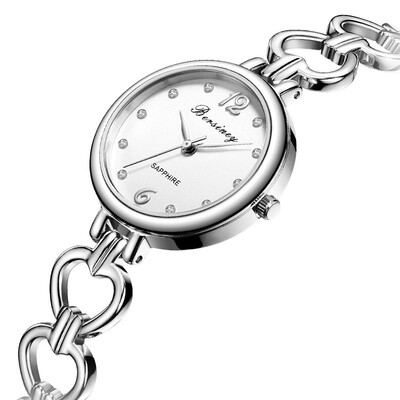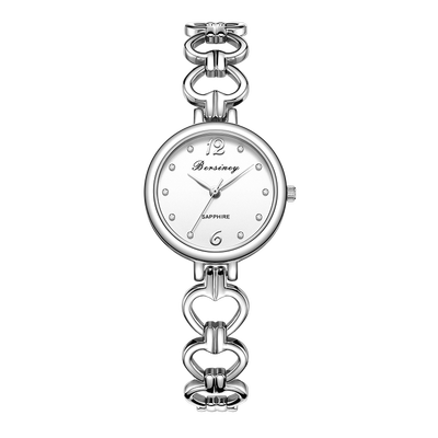 心形手链款式的腕带,清新优雅,银白的配色,圆形的小表盘,简约大气。