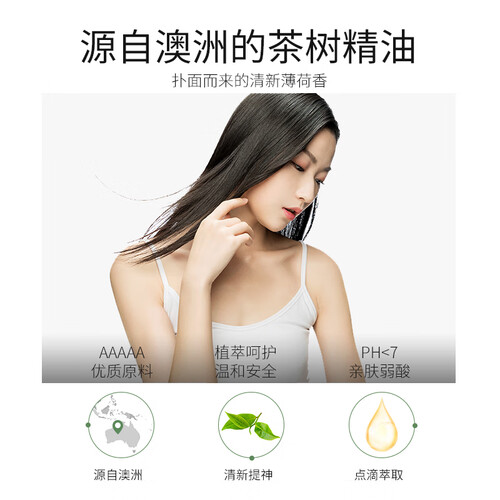 萃取茶树油精华,能够平衡油脂分泌,有效减少头屑再生。洋甘菊及薄荷精华成分能够刺激毛孔,有助于收敛止痒,舒缓头皮。