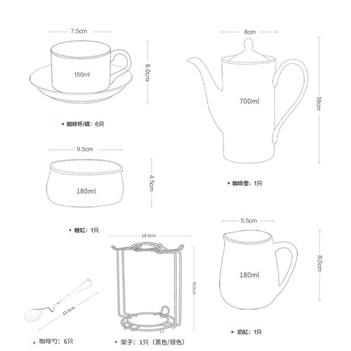 咖啡杯线条简洁流畅,质感光滑细腻,搭配流线型杯柄,更加精致。套装组合设计,杯碟、杯架以及勺子一应俱全,收纳更方便。