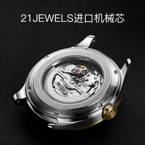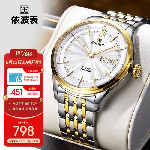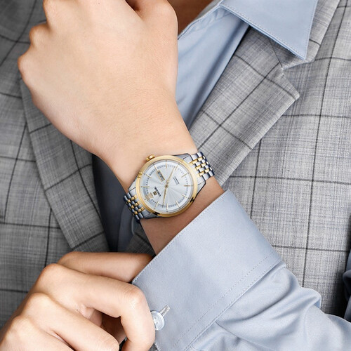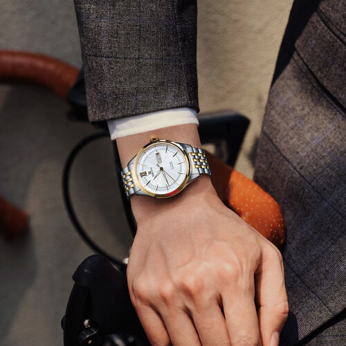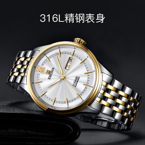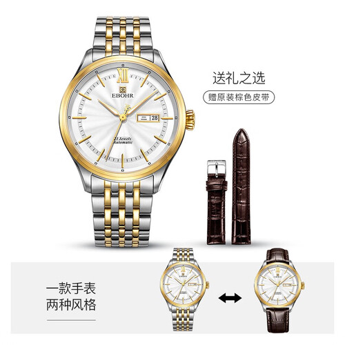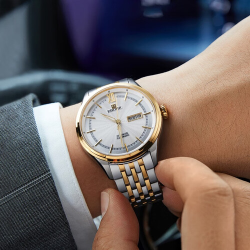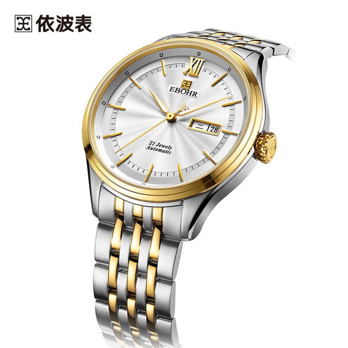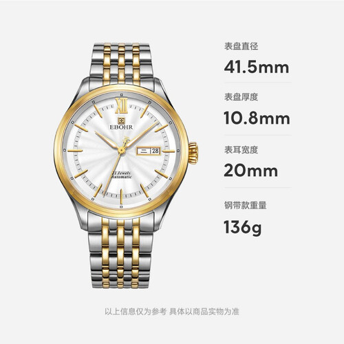 间金色的表带,具备银色的亮丽,以及金色的奢华。银白色的表盘加上金色的表圈,在视觉效果上会很大气。油压纹白面的表盘设计。