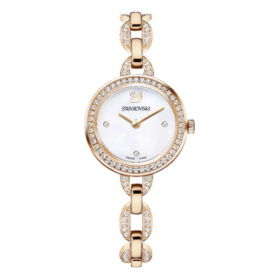 小巧造型配以光彩夺目的仿水晶镶钻,整只手表犹如一件精美的首饰品,佩戴着更加动人。镀玫瑰金色调,高雅有魅力,凸显质感。