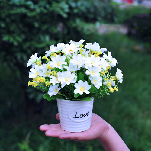 手掌大小的花盆,小巧精致,放在电视柜上特别的引人注目。彩色的花朵与真花相似,绿色的叶子衬托着花朵,造型很美。