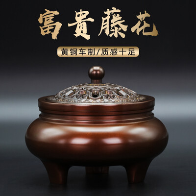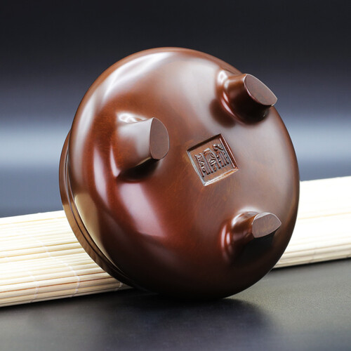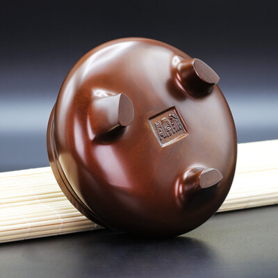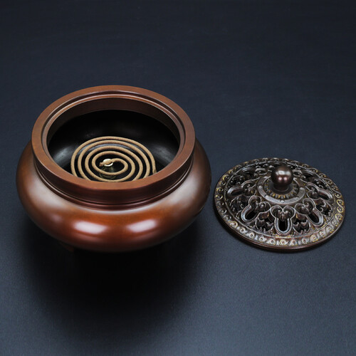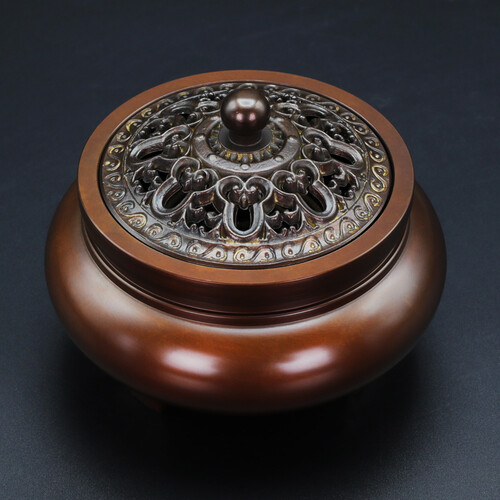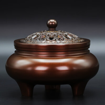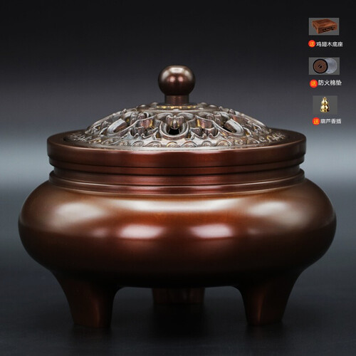 仿古设计的一款香炉,有着典型的中式古典元素表现,配套的盖子上有精致细腻的镂空雕刻装饰点缀,呈现典雅质朴的样貌。