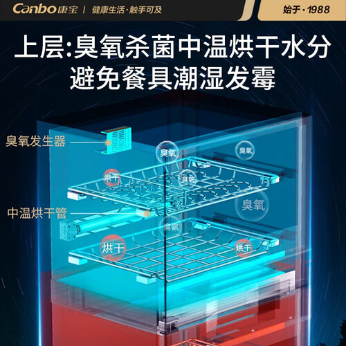 上层具有360°臭氧消毒功能,覆盖范围更广,消毒除菌更彻底。采用上下分控的设计,餐具较少时可以只开启一层,更加省电环保。