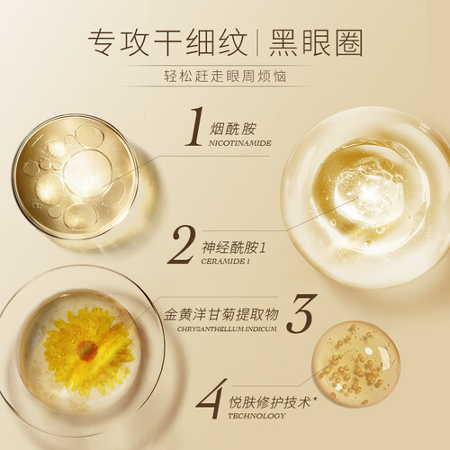 富有烟酰胺与神经酰胺成分,在肌肤表层形成保护屏障,紧紧锁住肌肤水分。含有金黄洋甘菊提取物成分,能够紧实眼周肌肤。