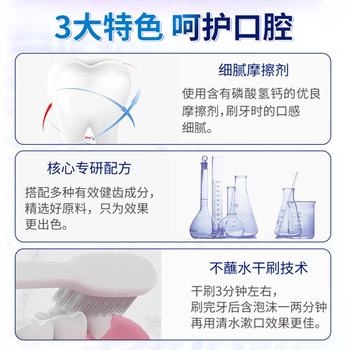 没有氟成分的添加,使得牙膏更加健康安全,适合长期使用,并且具有舒敏功效,能改善多种口腔问题,让你拥有健康口腔。