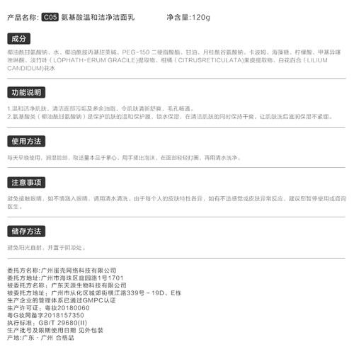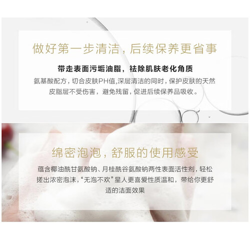 氨基酸成分温和低刺激,敏感肌也同样适用,采用绵密泡泡有效清洁毛孔,让脸部净透清爽,还有着很好的补水保湿效果。