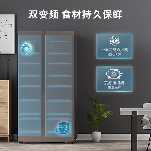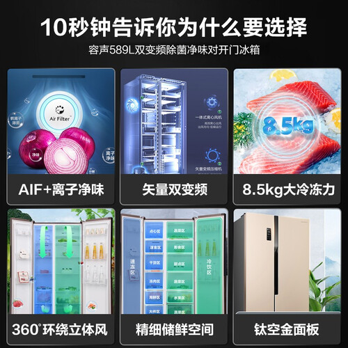 冰箱能够释放铜离子,后效避免细菌的滋生,使食物保持健康洁净。采用矢量双变频技术,温度更加稳定,食材不易变质。