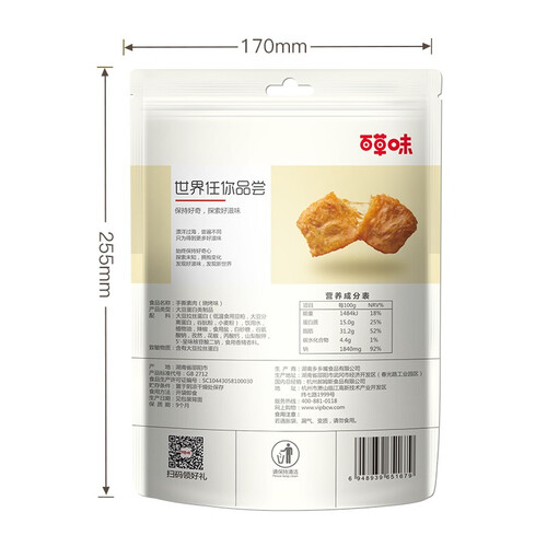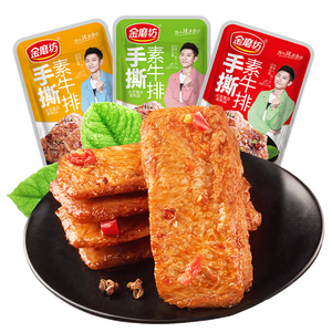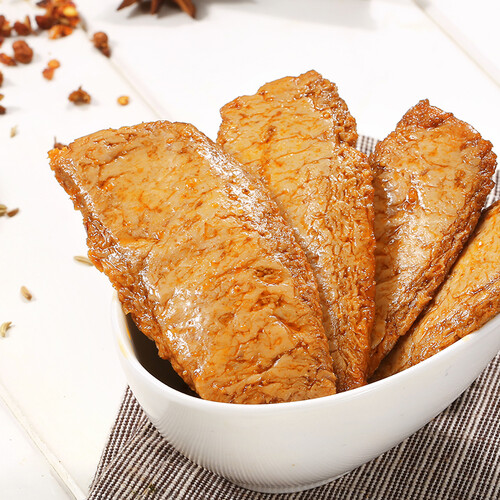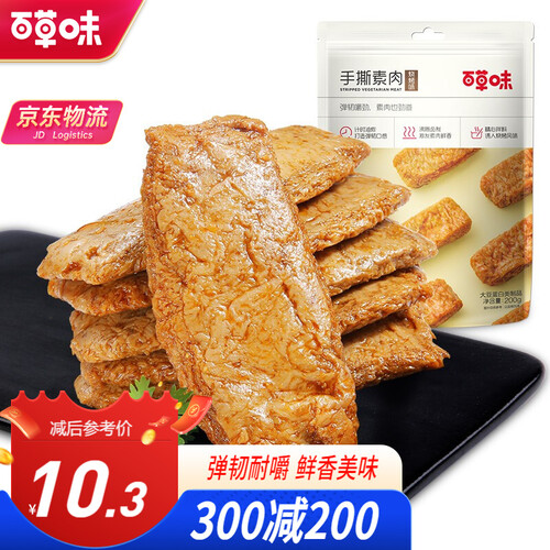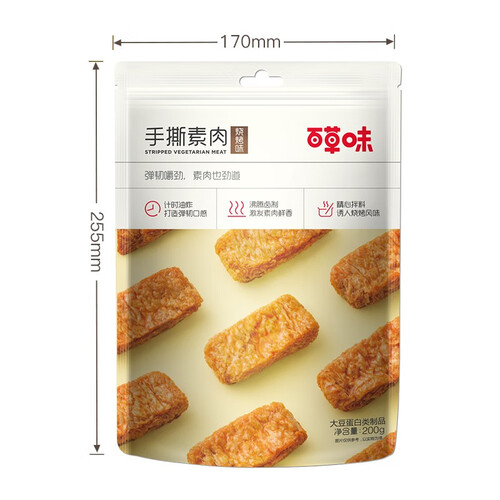 百草味手撕素肉选用上好原料,大豆蛋白紧密重组,呈现绵密纤维感,弹韧有嚼劲,先炸后卤再烘烤,赋予素肉好滋味。