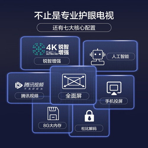 搭载65英寸高清全面屏,高屏占比显示,全景式大视野尽在眼前。通过护眼防蓝光认证,保持原画色彩的同时,改善视觉体验。