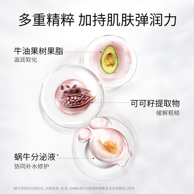 蕴含珍贵红参蜗牛精华,帮助修护肌底,增强肌肤屏障,让肌肤水润有弹性。还有3重天然珍粹,透明质酸锁水保湿,泛醇补水。