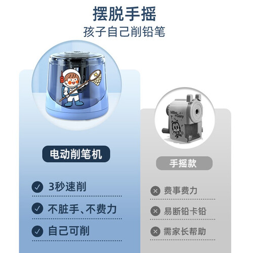 大容量透明视窗便于观察笔屑量,一拧一倒更省心,倾倒不脏手。USB+电池双重供电,动力澎湃输出,单手削笔,学习更有效率。