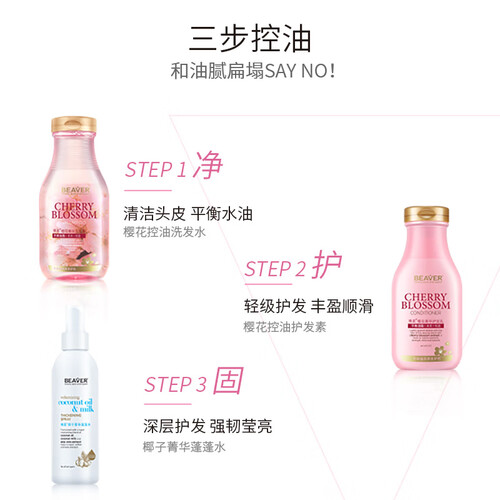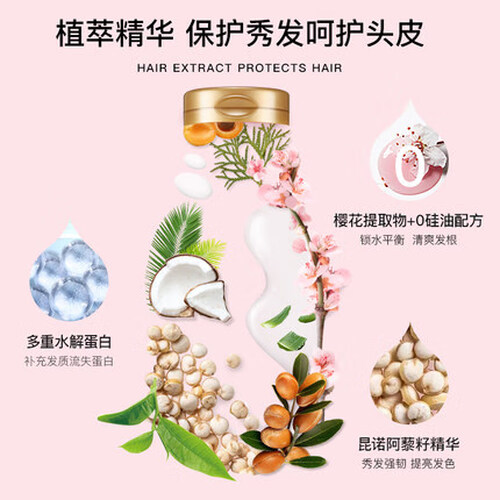 0硅油配方,使用不油腻。樱花提取物能够为发丝和头皮锁住水分,使您保持清爽感觉。多重水解蛋白,补充流失蛋白质,让发丝强韧。
