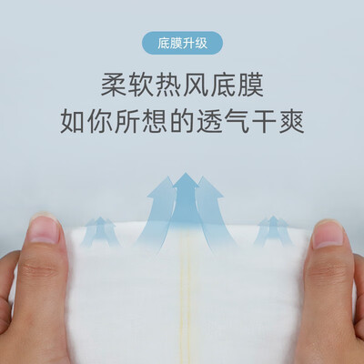 柔软的热风底膜设计,蓬松绵软,有助于气体循环流通,给小屁屁预留呼吸通道;弱酸性的PH值,避免刺激宝宝肌肤屏障。