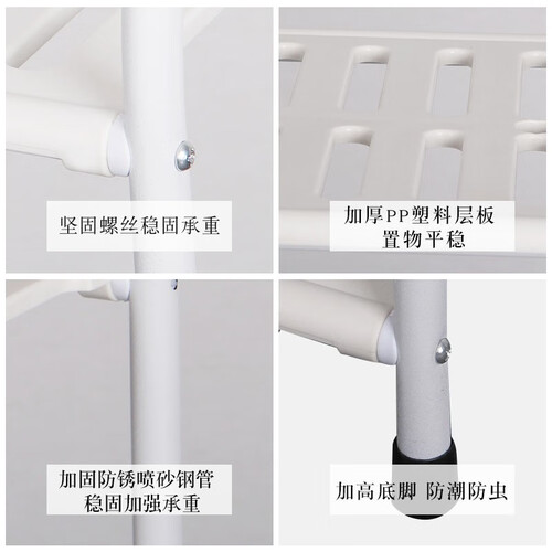 加厚PP塑料层板,承重能力强,使得置物架更加平稳。顶部设有圆滑小球装饰,圆滑细腻不伤手,同时起到装饰作用。