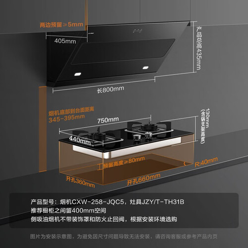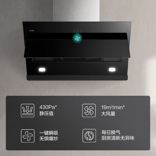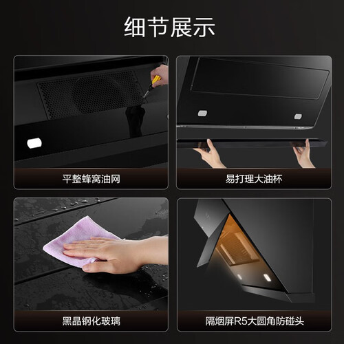 烟机采用一键瞬吸技术设计,吸力强劲,可快速吸除油烟,保持厨房空气清新。悬浮叠翼黑色外观,简约大气,百搭多种家装风格。