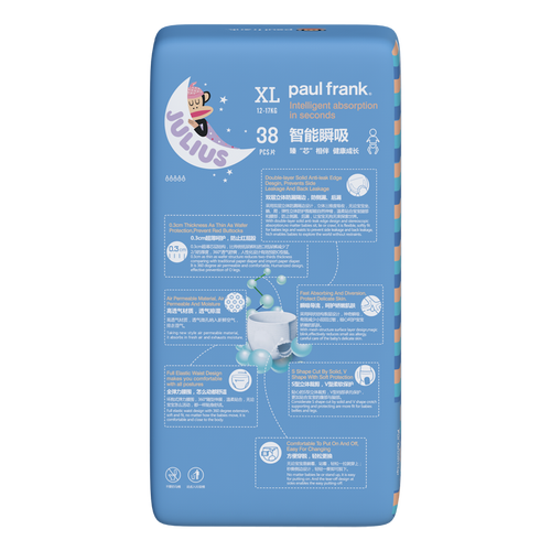 纤薄吸收芯上有全新瞬间吸收导流层,能快速均匀分散和吸收尿液,并且牢固锁住,像没尿过一样干爽。面层柔软舒适,轻盈透气。