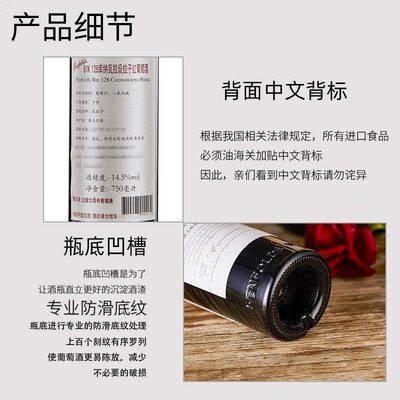 赤霞珠葡萄作为酿酒原料,酸甜度和单宁适中,符合大多人饮用口味,更好入口。瓶底凹槽设计,利于存储沉淀物,保证饮用口感。