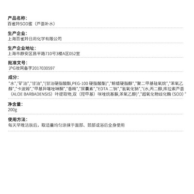 特别添加SOD与芦荟植物精华,帮助乳液更好的被肌肤吸收,长效滋润保湿。采用有机塑料制作而成的瓶身,有效保护乳液。