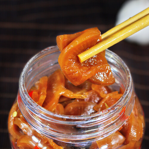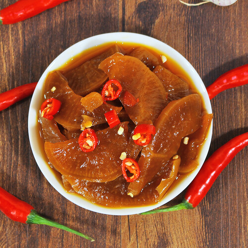 酱色的萝卜片,看着就让人口舌生津,吃到口中,清爽脆嫩。咸甜可口,易咀嚼。