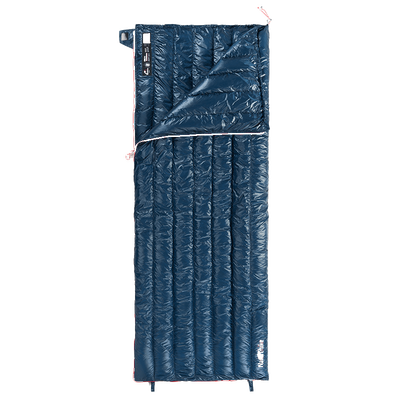 质地轻薄的信封式鹅绒睡袋,柔软透气防寒保暖,设计条形绒道,易于固定羽绒分布均匀。可自由拼接满足使用需求。