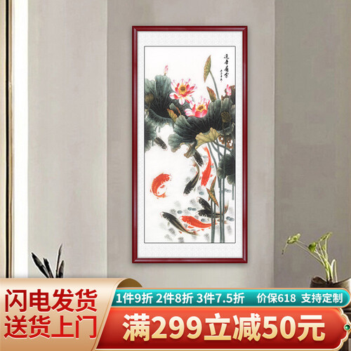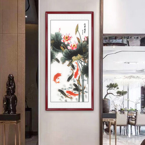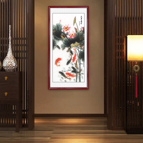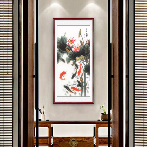 名为“连年有余”的装饰画,鱼儿栩栩如生,荷花含苞待放,一派生机昂扬的美好景象,富含中式古典韵味,可为家居添一份内涵。